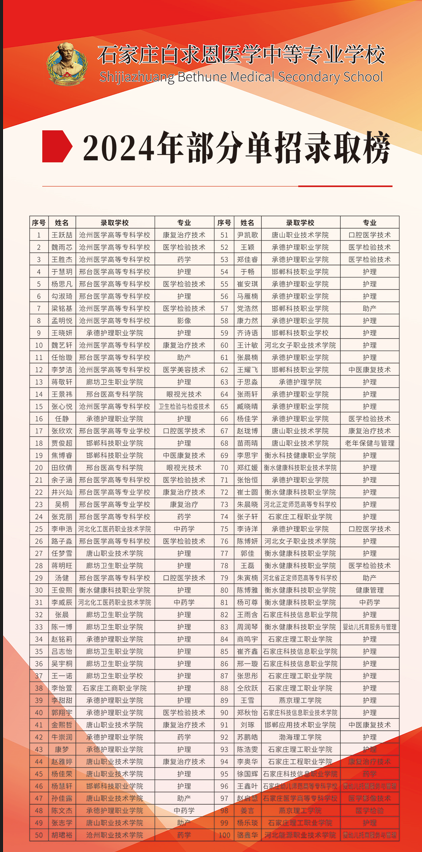 2024年石家庄白求恩医学中等专业学校单招和对口高考红榜,每年都有真实数据体现,随着这几年单招和对口高考压力竞争,单招升学率没有那么高了。但是相对其它医学中专也是首屈一指的。你的努力在这里能体现出来。不要因为孩子考不上高中就放弃,现在中职升学已经成了普通高考的重要组成部分。