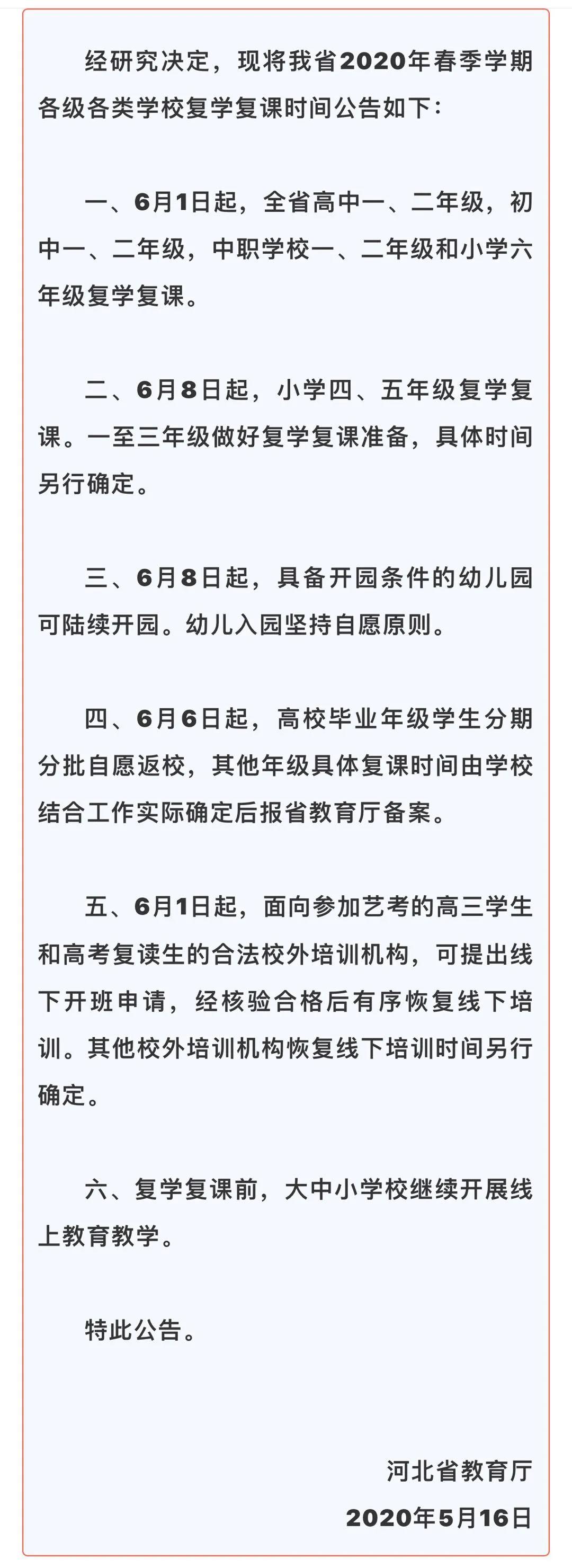 河北省关于各级各类学校复学复课时间的公告