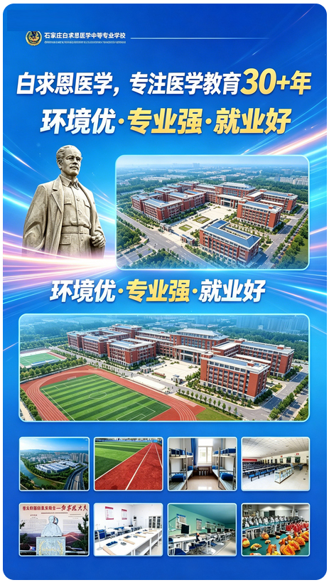 “初中毕业别瞎跑,白求恩医专给孩子稳出路!”“农村户口免学费,毕业能当护士、能升大专,不用再愁孩子没学上!”“军事化管理 + 医院实训,孩子在这学的都是真本事,毕业就能上班!”